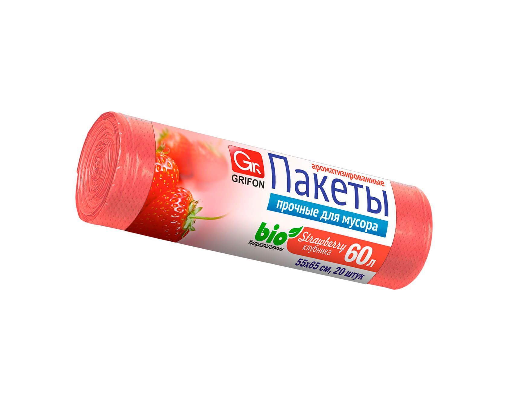 Мешки для мусора 60 л, ароматизированные, Клубника, красные, в рулоне 20 шт., ПНД, 9 мкм, 650х550 мм, GRIFON Aroma, 101-023 K