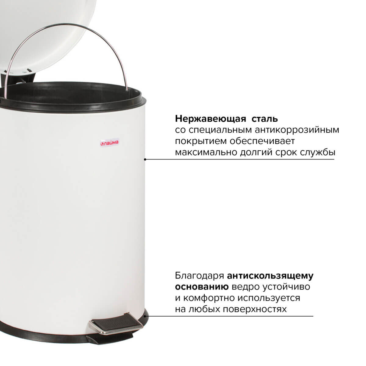 Внутреннее пластиковое ведро с рукояткой облегчает процесс выноса мусора. Изготовлено из нержавеющей стали с антикоррозийным покрытием, обеспечивая долгий срок службы. Устойчивая конструкция с антискользящим основанием гарантирует надежность.